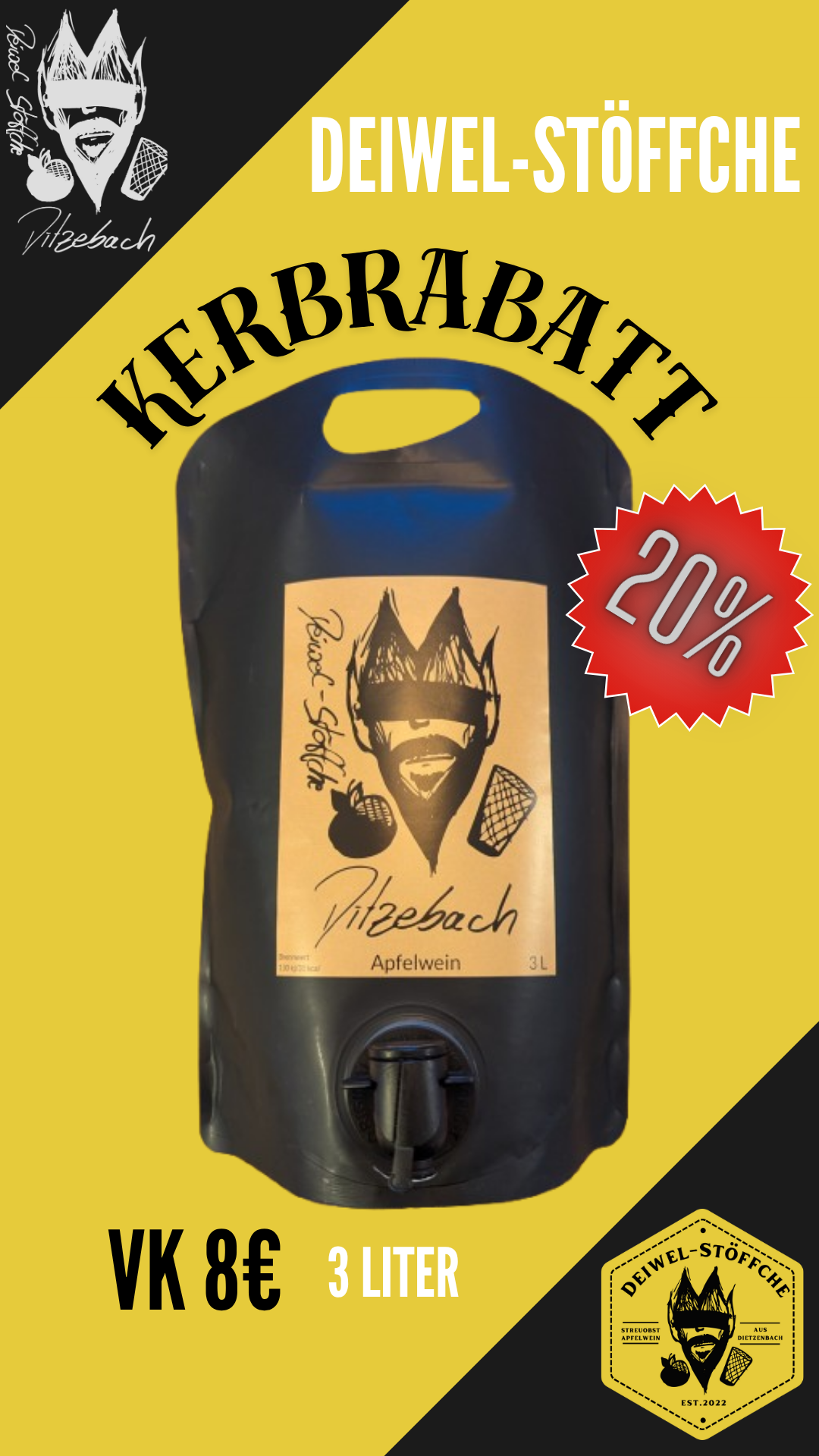 je Pouch Deiwel-Stöffche10 €8 € Kerbrabatt (3 Liter)