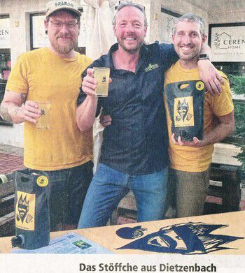 Ein typisch hessischer Abend – das wollte Marcel Echternach (mitte) den Dietzenbacherinnen und Dietzenbachern bieten. In seinem am Stadtbrunnen gelegene Cafe und Geschenkeladen „Echter Genuss“ öffnete er daher die Türen und lud zu Frankfurter Würstchen sowie Handkäs mit Musik ein. Dazu gehörte selbstverständlich auch das eine oder andere Glas Apfelwein. Und der kam – passend zu dem hessischen Event – direkt aus der Region. Hergestellt wurde er von den Kelterern Erik Steinheimer (links) und Gerolf Baum (rechts) und das ausschließlich mit sordfältig ausgewählten Äpfeln, die von Streuobstwiesen aus Dietzenbach und Umgebung stammen. Mehrere Monate reifte ihr sogenanntes „Deiwel-Stöffche“. Nun ist der heimische Ebbelwoi fertig für den Verkauf, was Echternach zum Anlass nimmt und ihn ab sofort auf die Getränkekarte seines Cafes setzt. Und tatsächlich ist der „sanfte Einstiegsäppler“, wie ihn Echternach liebevoll nennt, am „hessischen Abend“ ein großer Hit bei den Gästen. Denn immer wieder verteilen die Kelterer Schlucke zum Probieren. (OP-Kleint)