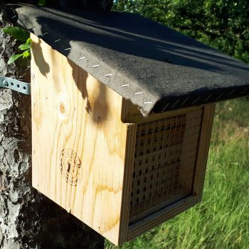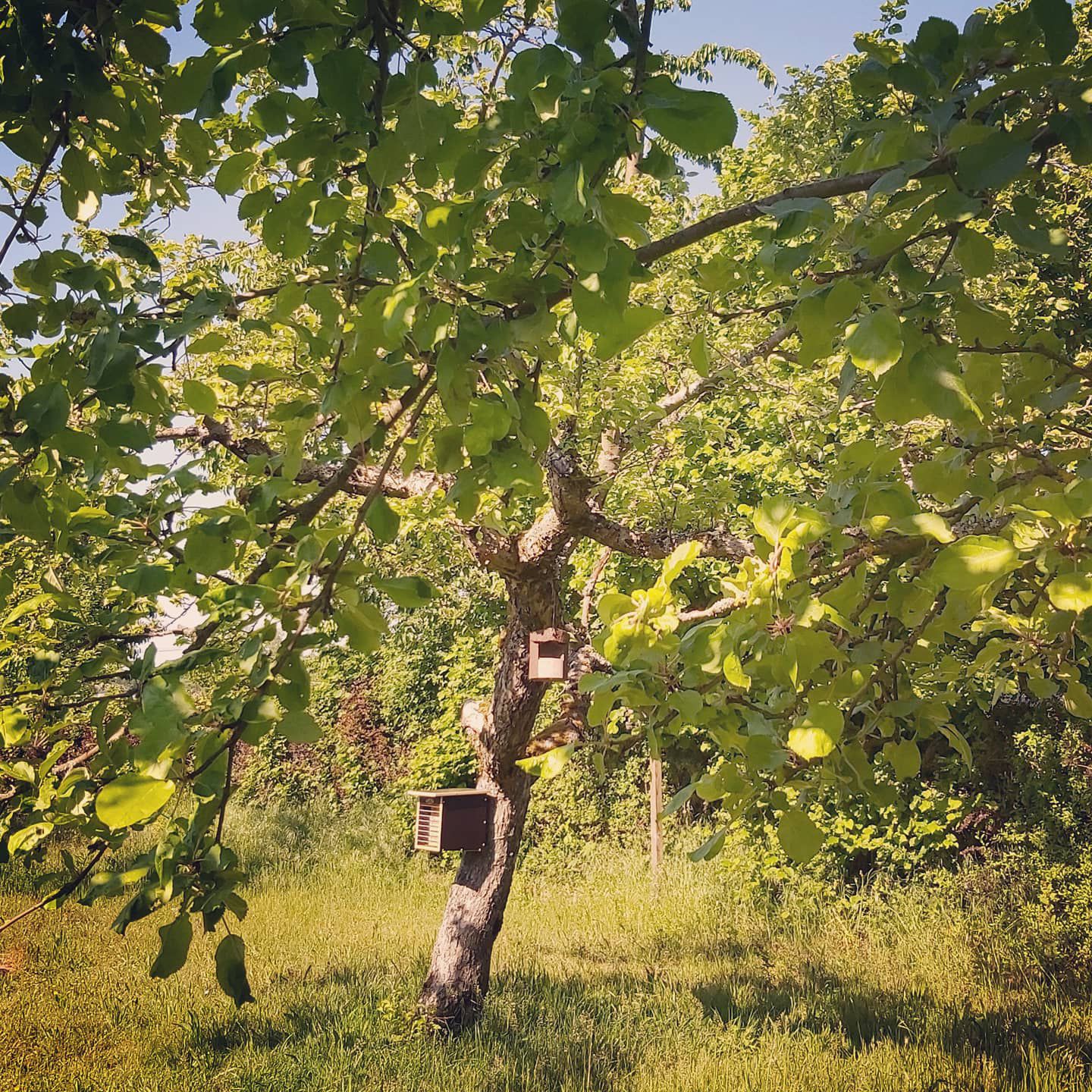 So siedelten wir, natürlich mit dem Hintergedanken der außergewöhnlich guten Bestäubung, die gehörnte und die rostrote Mauerbienen an. Aber dabei blieb es nicht. Auch für andere Arten sollte es Nisthilfen oder einfach ein Zuhause geben. Mittlerweile stehen und hängen auf den Wiesen: Ein Hummelkasten, ein Hornissenkasten (obwohl die Hornissen lieber in den Vogelkästen nisten), mehrere Vogelhäuschen, ein Fledermauskasten und zwei Steinkautzkästen. Weitere Bewohner sind die Zauneidechse und der Siebenschläfer.