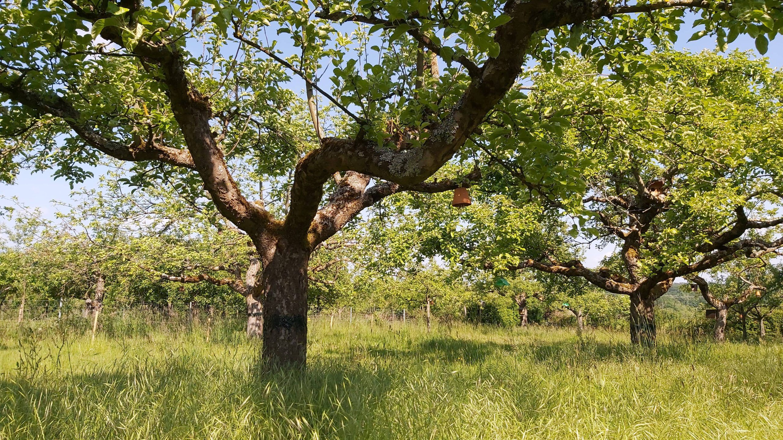 Auf diesen Wiesen, mit mittlerweile 1,1 Hektar Fläche, wachsen 100 Bäume mit allein 46 verschiedenen Apfelsorten.